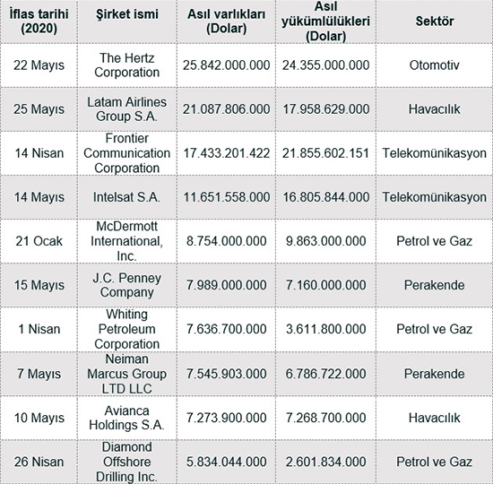 Bugüne kadar iflas erteleme yasasına (Chapter 11) başvuran en büyük şirket araba kiralama firması Hertz oldu. Turizm endüstrisinin aniden durmasıyla birlikte şirket kreditörlerin isteklerini karşılayabilmek için filosunun büyük bir bölümünü satışa çıkardı. Enerji sektöründen perakendeye, otelcilikten havacılığa kadar birçok sektör salgın olumsuz etkilerinden benzer acıları çektiler.