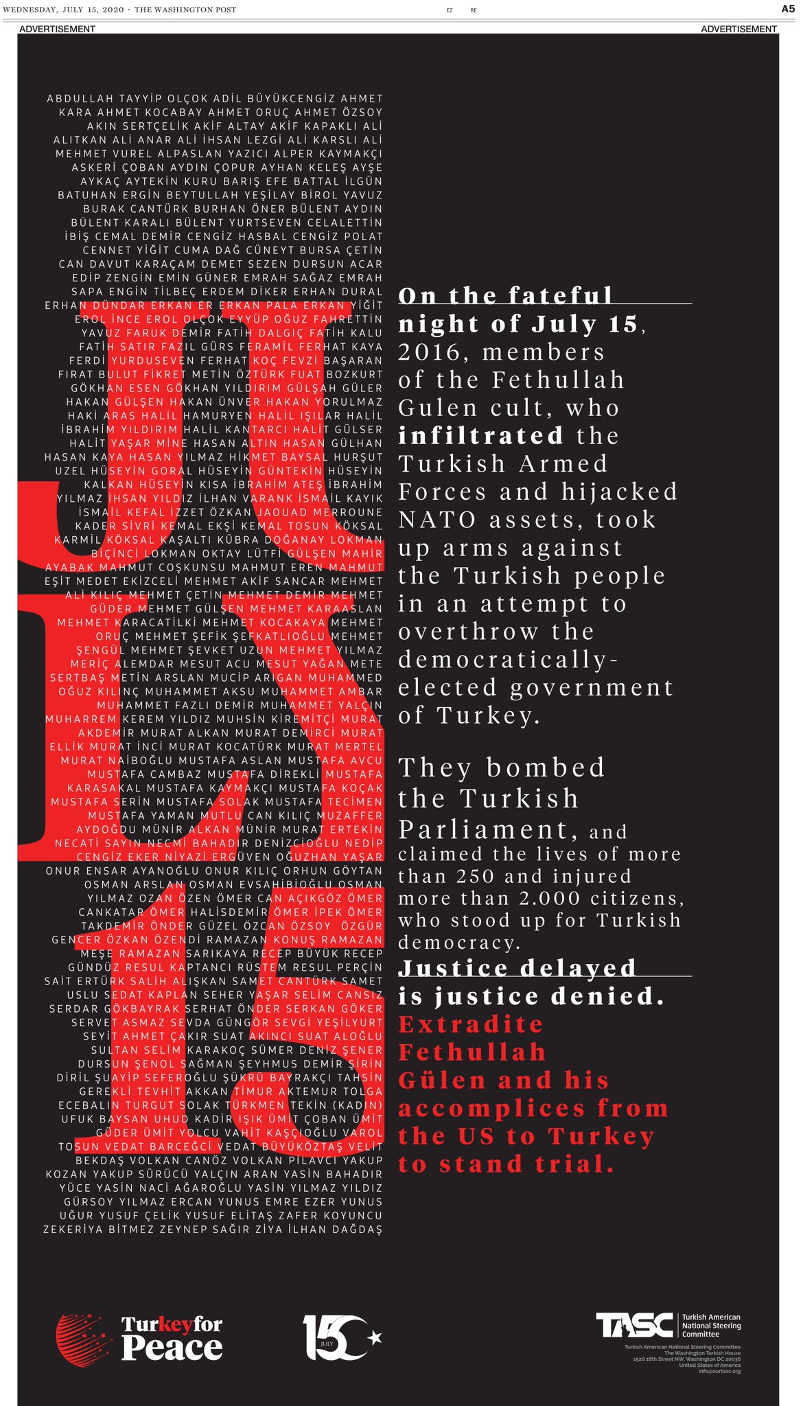 Türk Amerikan Ulusal Yönlendirme Komitesi (TASC) 15 Temmuz hain darbe girişiminin yıldönümünde Washington Post gazetesinde bir ilan yayınladı.
