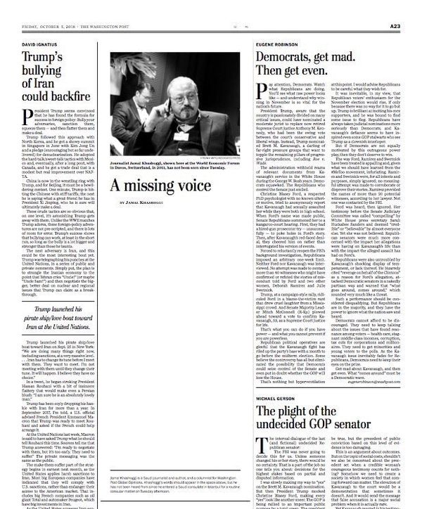 Gazetenin internet sitesinde de Kaşıkçı'nın köşesine girildiğinde okuyucuları beyaz bir sayfa karşılıyor. Sayfanın altında yer alan editör notunda ise, "Cemal Kaşıkçı bir Suudi gazeteci ve yazar ve aynı zamanda Washington Post Küresel Fikirler için yazan bir köşe yazarı. Kaşıkçı'nın sözleri yukarıdaki boşlukta yer almalıydı ancak Salı öğleden sonra rutin bir konsolosluk işlemi için İstanbul'daki Suudi konsolosluğuna girdikten sonra kendisinden haber alınamadı" ifadelerine yer verildi.