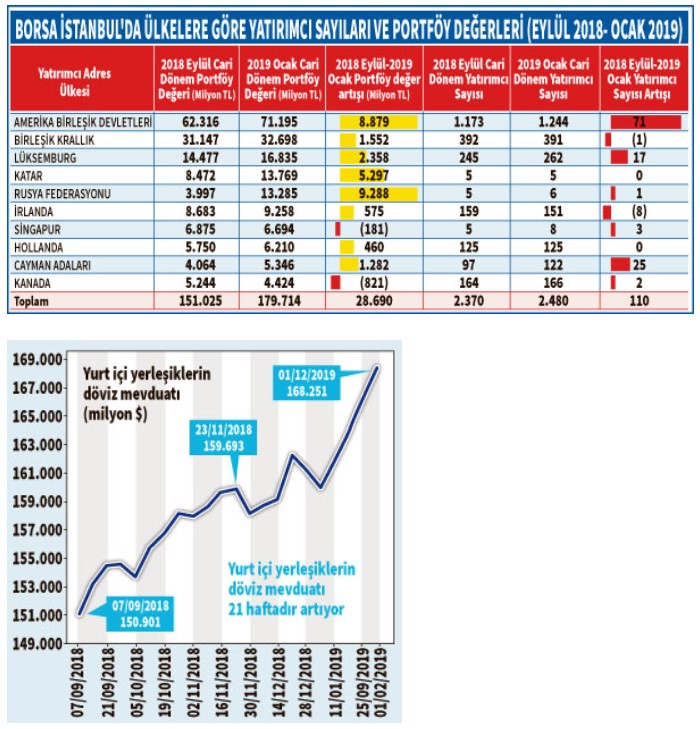- ABD’li yatırımcılar Türkiye’de portföyü en yüksek 2.480 yatırımcının yüzde 50’sini oluşturuyor. Onu yüzde 15 ile Birleşik Krallık, yüzde 10 ile Lüksemburg izliyor. En düşük pay; Katar, Rusya ve Singapur.
