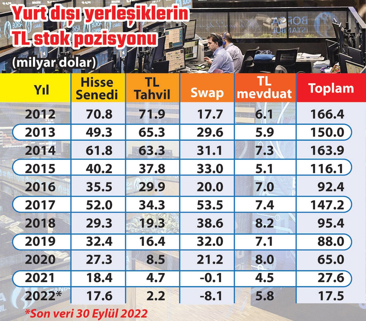 Yabancı elindeki TL varlıklar özellikle son iki yıldır günden güne erirken, 10 yılda hisse senetleri, tahvil ve bankalarda bulunan yabancı yatırımcı TL varlık stokundan yaklaşık 149 milyar doların buharlaştığı görülüyor. Uluslararası kredi derecelendirme kuruluşlarından peş peşe not artırımlarıyla birlikte Türkiye'ye en yüksek portföy girişi 2012'de görülmüştü. 2012'de yani bundan 10 yıl önce yabancılara ait TL varlık stoku 166.4 milyar dolara kadar ulaşıyordu. Aradan geçen 10 yılda 148.9 milyar dolar adeta buhar oldu. Yabancıların Türk hisse senedi sahipliği 2004 tarihinden beri en düşük seviye olan yüzde 32.08'e inerken, Türk tahvil sahipliği ise yüzde 2.5'lara düştü. Eylül sonu itibarıyla yabancı yatırımcıya ait hisse senedi stoku 17.6 milyar dolar, tahvil stoku ise 2.2 milyar dolara geriledi. Kur ve faiz belirsizliği yabancıların dolar cinsinden borçlanıp Türk Lirası'na yatırım yaptığı carry trade işlemlerini de dibe çekti. Yabancıların swap pozisyonu eksi 8.1 milyar dolar oldu. Bankalarda ise yurt dışı yerleşiklere ait 5.8 milyar dolar kaldı.