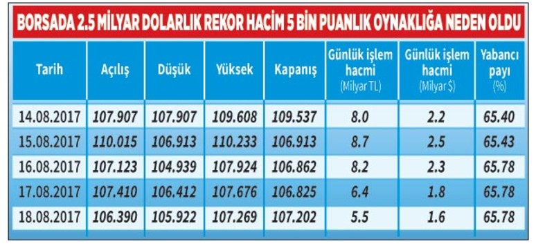 Borsa zirvede iken gerçekleşen rekor hacim yatırımcıları ürküttü. 8,6 milyar TL’lik yani yaklaşık 2,5 milyar dolarlık rekor işlem hacmi ile en yüksek noktada yaşanan sirkülasyon ve artan spekülatif işlemler yatırımcılarda soğuk duş etkisi yarattı. Endeks 110 bin 232 seviyesindeki zirveden 104 bin 939 seviyesine kadar geriledi ve haftayı yeniden 107 bin 202 seviyesinden tamamladı. Gözlerini ekrandan ayıramayan yatırımcı ise neler olduğunu anlamaya çalışıyor. Bunun en önemli nedeni ise 104 bin seviyesinin aşağı doğru kırılması halinde teknik olarak sıkıcı bir sürecin başlayabilecek olması. Öte yandan gerçekleşen yüksek hacim bir çok soru işaretini de beraberinde getiriyor. Ancak yaşanan sadece yabancıların şimdilik düşük miktarlarda da olsa bazı hisselerde pozisyon azaltması ve bazılarında artırması.