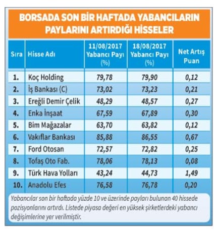 Yabancılar 40 tane hisse senedinde pozisyonlarını ortalama yüzde 0,65 oranında artırdı. Bu hisselerde yüzde 10’un üzerinde payları var. Listedeki şirketleri piyasa değeri 10 milyarın üzerinde olanlara göre sırladığımızda en fazla ilgi gören 10 şirket şunlar: Koç Holding, İş Bankası (C), Ereğli Demir Çelik, ENKA İnşaat, BİM Mağazalar, Vakıflar Bankası, Ford Otosan, Tofaş Oto. Fab., Türk Hava Yolları ve Anadolu Efes.