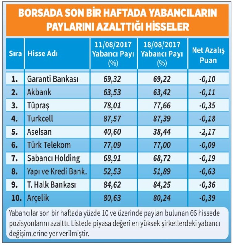 Yabancıların ana pozisyonlarını korudukları ve kâr realizasyonuna dönük satış yaptıkları şirket sayısı ise 66. Bu 66 hissede ortalama yüzde 0,80 oranında paylarını azalttılar. Bu şirketleri piyasa değerlerine göre sıraladığımızda ilk 10 içerisinde ağırlıklı olarak bankalar var. Listedeki hisseler ise şöyle: Garanti Bankası, Akbank, Tüpraş, Turkcell, Aselsan, Türk Telekom, Sabancı Holding, Yapı ve Kredi Bank., T. Halk Bankası, Arçelik.