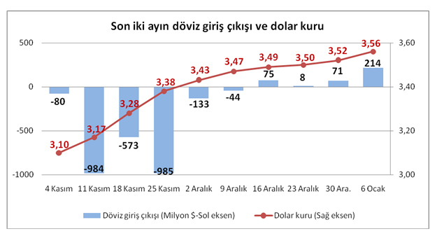 Dolarda hızlı artışın başladığı Ekim ayından sonraki dönemde döviz tevdiat hesaplarında öyle belirgin dalgalanmalar görülmedi. Daha önce 4-11 Kasım haftasında 3.7 milyar dolarlık bir azalma olmuştu. Son olarak 30 Aralık-6 Ocak haftasında da 2.5 milyar dolarlık bir azalma görüldü.