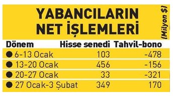Merkez Bankası tarafından açıklanan verilere göre, yabancı yatırımcılar 27 Ocak- 3 Şubat haftasında Borsa İstanbul'da 349 milyon dolarlık net alım gerçekleştirirken, tahvil ve bonoda da 170 milyon dolarla bir ay aradan sonra tekrar yeni pozisyon açtı. Borsada son 4 haftadaki net alım ise 950 milyon dolara ulaşırken yabancı payı yüzde 64.48 ile 1 yılın zirvesine ulaştı. Borsada bir ayda 350 milyon adet hisse senedi alımı gerçekleştirildi.
