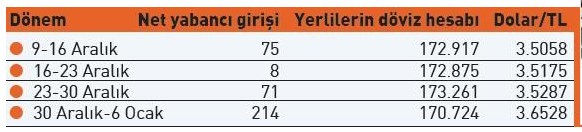 Sığ piyasada döviz kurlarının rekor kırdığı son 4 hafta içerisinde, Moody's ve Fitch'in yayımladığı olumsuz raporlar devreye sokulmasına rağmen, yabancılar Türk hisse senedi ile hazine kağıtlarına koştu. 9 Aralık-6 Ocak tarihleri arasındaki 4 hafta içerisinde yabancı yatırımcılar hisse senedi ile tahvil-bono piyasasında yaklaşık 370 milyon dolarlık net alım gerçekleştirdi. Bu dönemde yurtiçinde yerleşiklerin döviz hesapları da 2.2 milyar dolar azaldı.