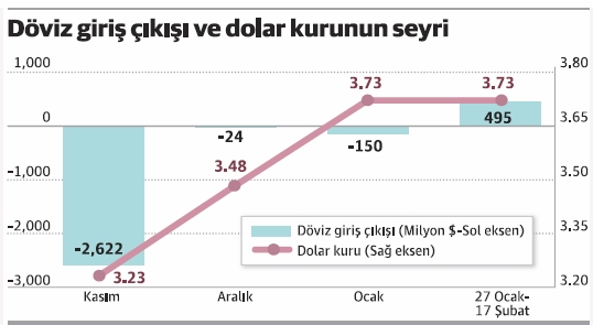 Köşemizi sürekli izleyen okuyucularımızın neredeyse ezberledikleri, ama her hafta yenilediğimiz bir grafiğimiz var. Merkez Bankası'nın yabancıların hisse senedi ve devlet iç borçlanma senedindeki net alım-satımlarını ve ilgili dönemde ortalama dolar kurunun hangi düzeyde oluştuğunu gösteren grafik.