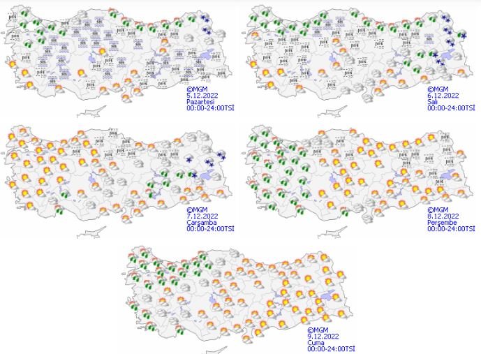 Yağışların genellikle yağmur ve sağanak, Doğu Karadeniz’in iç kesimlerinin yüksekleri ile Doğu Anadolu’nun kuzeydoğusunda karla karışık yağmur ve kar şeklinde olması bekleniyor. Marmara’nın güneyi ve doğusu ile iç ve doğu kesimlerde sabah ve gece saatlerinde yer yer sis ve pus hadisesi görüleceği tahmin ediliyor.