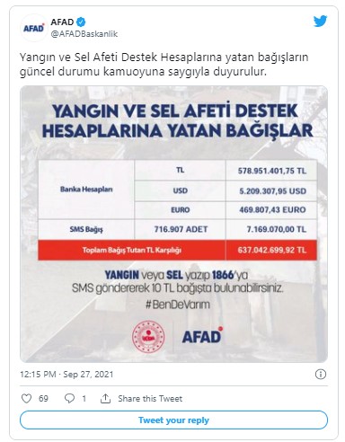 AFAD'ın Twitter hesabından yapılan paylaşımda, SMS, Türk lirası, dolar ve euro olarak yapılan bağışların toplam 637 milyon 42 bin 699 liraya ulaştığı duyuruldu.