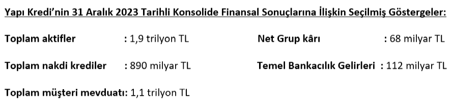 2023 yılında toplam nakdi kredi hacmi 2022 yıl sonuna göre yüzde 52 oranında artarak 890 milyar liraya yükselen Banka’nın aktif büyüklüğü yüzde 57’lik yükselişle 1,9 trilyon liraya çıktı. Toplam müşteri mevduat hacmi bir önceki yılın aynı dönemine göre yüzde 55 artışla 1,1 trilyon liraya ulaşan Yapı Kredi’nin, öz kaynak karlılığı da yüzde 45 olarak gerçekleşti. Banka’nın sermaye yeterlilik rasyosu ise (yasal düzenlemelerin olumlu etkileri dışarıda bırakıldığında) yüzde 16,9 oldu.