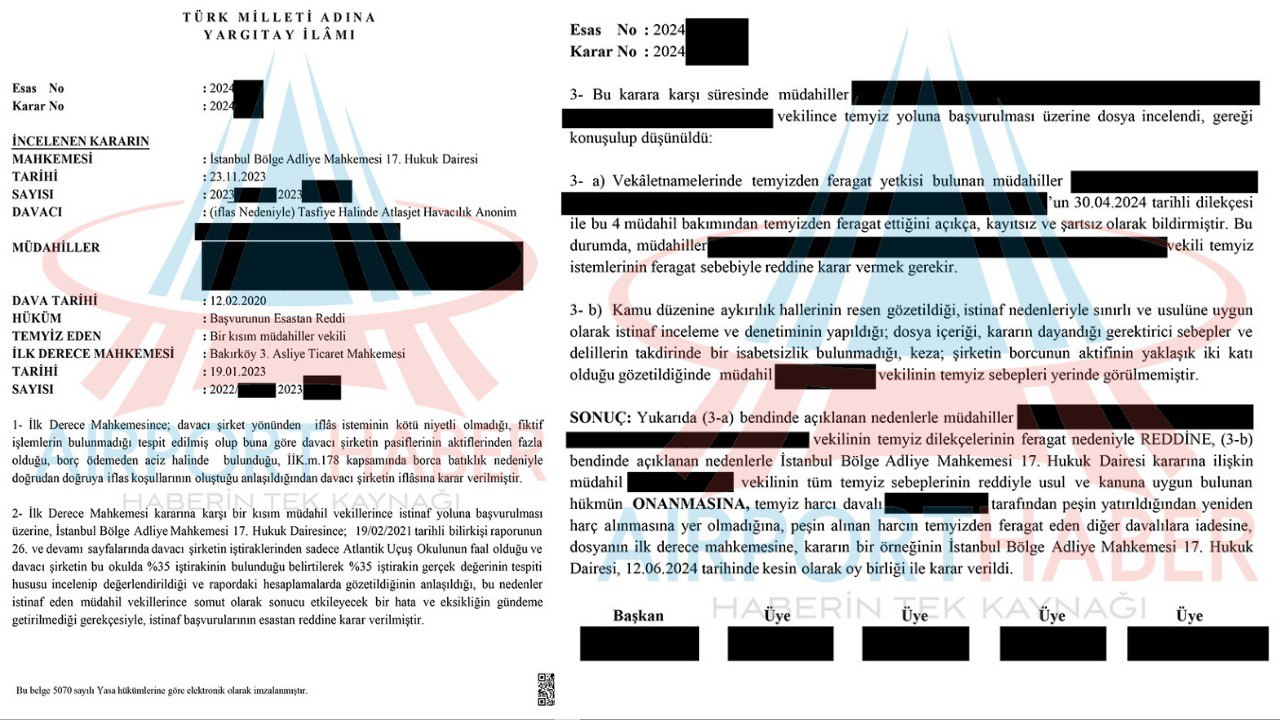 Haziran 2021'de iflasını ilan eden Türkiye'nin köklü hava yolu şirketlerinden Atlasglobal'in (Atlasjet Havacılık A.Ş.) iflasına ilişkin Yargıtay'dan onama kararı çıktı.