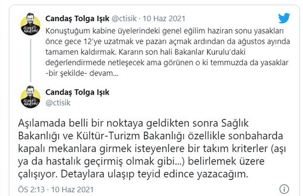 Gazeteci Candaş Tolga Işık, sosyal medya üzerinden yaptığı paylaşımda "Konuştuğum kabine üyelerindeki genel eğilim haziran sonu yasakları önce gece 12’ye uzatmak ve pazarı açmak ardından da ağustos ayında tamamen kaldırmak" ifadesini kullandı.