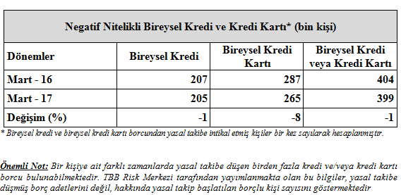 Türkiye Bankalar Birliği Risk Merkezi’nin, Negatif Nitelikli Bireysel Kredi ve Kredi Kartı Mart 2017 Raporu’na göre; bireysel kredi veya bireysel kredi kartı borcundan dolayı yasal takibe giren kişi sayısı yılın ilk üç ayında geçen yılın aynı dönemine göre %1 azalarak 399 bin kişi oldu.