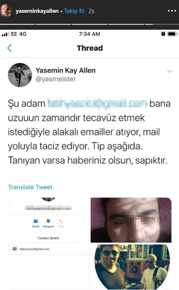 30 yaşındaki oyuncu, Instagram'ın hikaye bölümünden, "Şu adam bana uzun zamandır tecavüz etmek istediğiyle alakalı e-mailler atıyor, mail yoluyla taciz ediyor. Tip aşağıda. Tanıyan varsa haberiniz olsun, sapıktır" mesajını yayınladı.