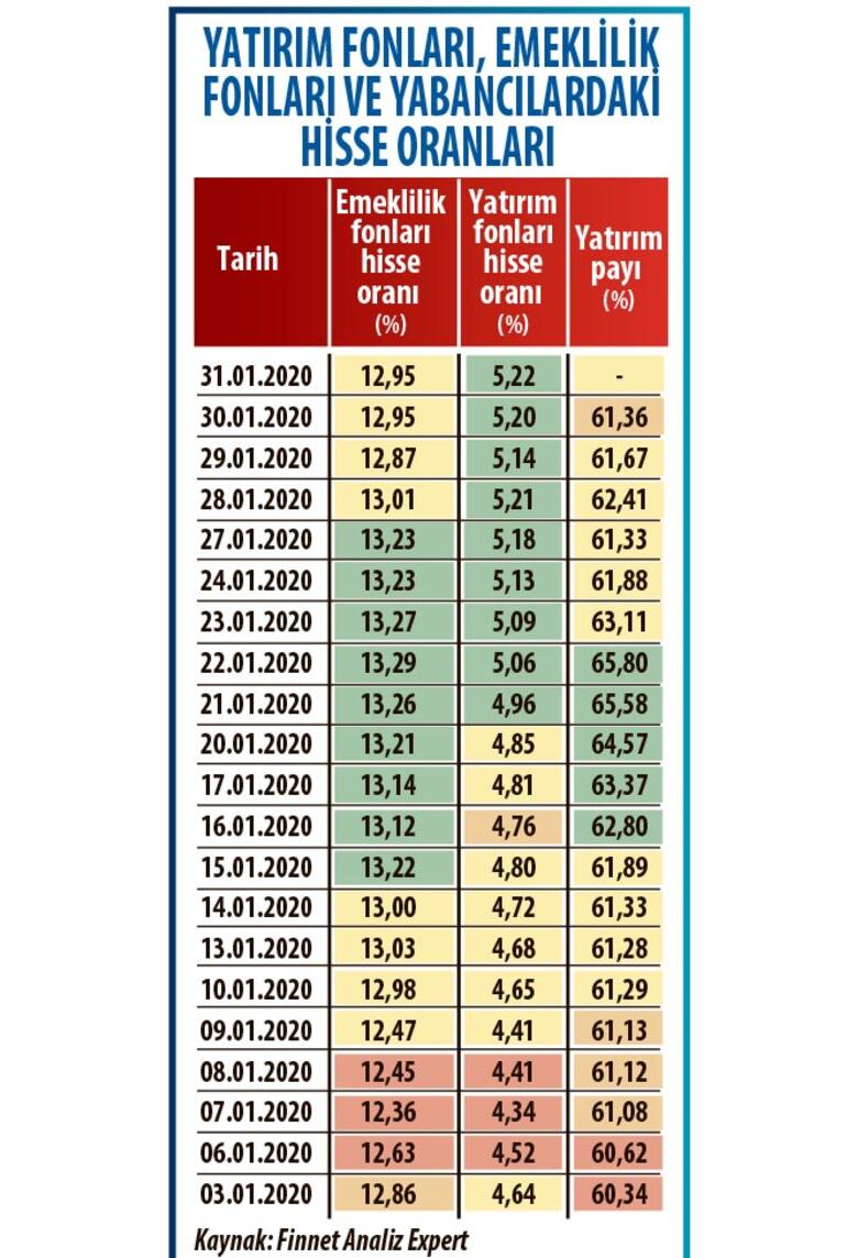 Bir kısmı takaslardaki hareketlilikten kaynaklansa da yabancı paylarının yüzde 61,36 ile dip seviyelerdeki yüzde 60’lara yakın bir seyir izlediği gözleniyor. Emeklilik fonlarının hisse oranında bir miktar azalma var. 21 Ocak’ta yüzde 13,26’ya kadar yükselen emeklilik fonlarındaki hisse senedi oranı şimdilerde yüzde 12,95 seviyesine gerilemiş durumda.