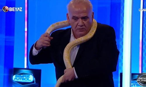 Çakar'ın şovu tşörtle de sınırlı kalmadı. Stüdyoya bir kutu içerisinde kobra yılanı getirten Çakar, yılanı boynuna dolayarak şovuna devam etti.