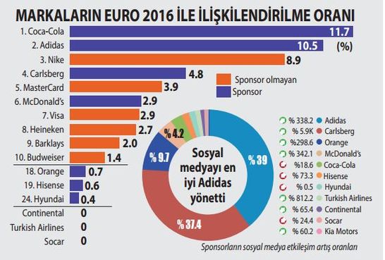 Euro 2016’nın resmi sponsorlarına gelince. UEFA öngörülerine göre EURO 2016’daki 51 maç dünyada toplam 6 milyar TV seyircisi tarafından seyredilecek. Maç başına ortalama 150 milyon, final maçı için de 300 milyon TV seyircisi öngörülüyor. Hal böyle olunca da özellikle resmi sponsorların ödediği ücretlerin karşılığını alıp almadıkları da merak konusu oluyor. Sosyal medya kuşkusuz firmaların bu etkileşimi en iyi ölçümledikleri mecralardan biri. TalkWalker’da yer alan analize göre, geçen hafta sonu sosyal medyayı en iyi yöneten ve en çok mesaj alan sponsor Adidas oldu. Yine sponsorlardan Carlsberg, sosyal medyada açtığı ‘Man of the Match’ (Maçın Adamı) Twitter başlığı ile ikinci sırada yer aldı. Analize göre, THY’de sosyal medyada etkilemişini artıran sponsorlar arasında yer aldı.