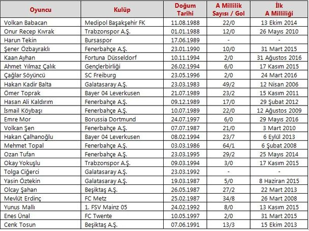 A Milli Takımımızın, 2018 FIFA Dünya Kupası Avrupa Elemeleri I Grubu'nda 6 Ekim 2016 Perşembe günü Ukrayna ve 9 Ekim 2016 Pazar günü İzlanda ile oynayacağı karşılaşmaların aday kadrosu açıklandı.