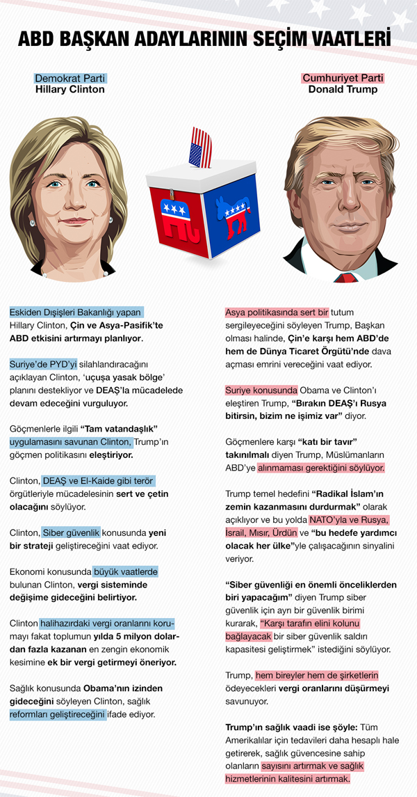 ABD'de seçimlere bir gün kala Demokrat aday Hillary Clinton ve Cumhuriyetçi aday Donald Trump ve arasındaki rekabet de iyice kızıştı. Yaklaşık iki yıldır devam eden seçim sürecinde Trump ve Hillary Clinton, Amerikalılardan oy almak için iç politika ve dış politika konularında çeşitli vaatlerde bulundular. Düzenledikleri seçim kampanyaları boyunca vaatlerini sıralayan başkan adaylarının gündemindeki en önemli konu başlıkları ise ekonomi, sağlık reformu, ulusal güvelik, uluslararası terörizm ve ABD'nin hegemonyasını sürdürmesini sağlayacak yeni stratejiler üzerine kurulu oldu.