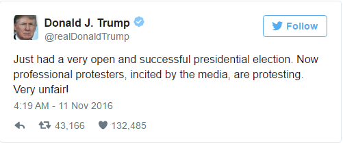 Cumhuriyetçi Trump, ABD Başkanı Barack Obama ile Beyaz Saray’da bir araya geldikten sonra Twitter hesabından paylaştığı mesajda, gösterilerin “insafsız” olduğu ifade etti.
