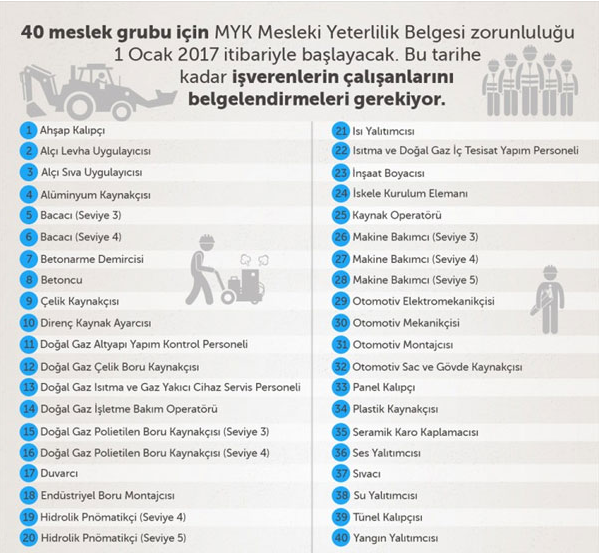 Hükümet hem iş gücü piyasasında arz-talep uyumunu artıracak hem de iş kazalarının önüne geçecek önemli adım attı. Mesleki Yeterlilik Kurumu Mesleki Yeterlilik Belgesi Zorunluluğu Getirilen Mesleklere İlişkin Tebliğ 25 Mayıs 2015 tarihli ve 29366 sayılı Resmi gazete'de yayımlanarak yürürlüğe girdi. Bu kapsamda söz konusu tebliğ ile birçok meslekte MYK Mesleki Yeterlilik Belgesi zorunlu hale getirildi.