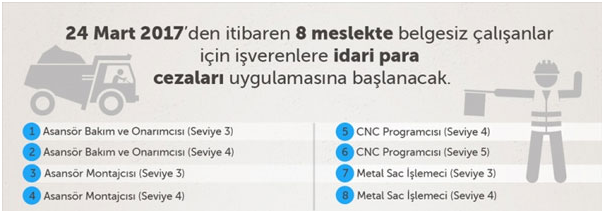 Bu doğrultuda, 1 Ocak 2017 tarihine kadar işverenlerin çalışanlarını belgelendirmeleri gerekiyor. Yeni yıldan itibaren yapılacak teftişlerde iş müfettişleri tarafından MYK Mesleki Yeterlilik Belgesi zorunluluğu bulunan 40 meslekte belgesiz çalışanlar için işverenlere, her bir çalışan için 500 TL idari para cezası uygulanacak. 24 Mart 2017'den itibaren de 8 meslekte belgesiz çalışanlar için işverenlere idari para cezaları uygulamasına başlanacak.