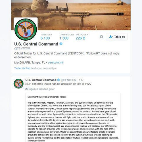 CENTCOM'un sosyal medya hesabı Twitter'da, SDG imzası taşıyan ve büyük bölümünü PYD/YPG'nin oluşturduğu yapının "PKK ile ilişkisinin olmadığını iddia eden" açıklamayı paylaşılması tepki çekti.