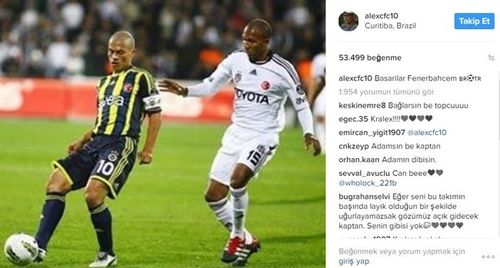 Instagram hesabından bir Beşiktaş-Fenerbahçe maçında çekilmiş fotoğrafını paylaşan Alex e Souza, yanına da "Başarılar Fenerbahçem" yazdı.