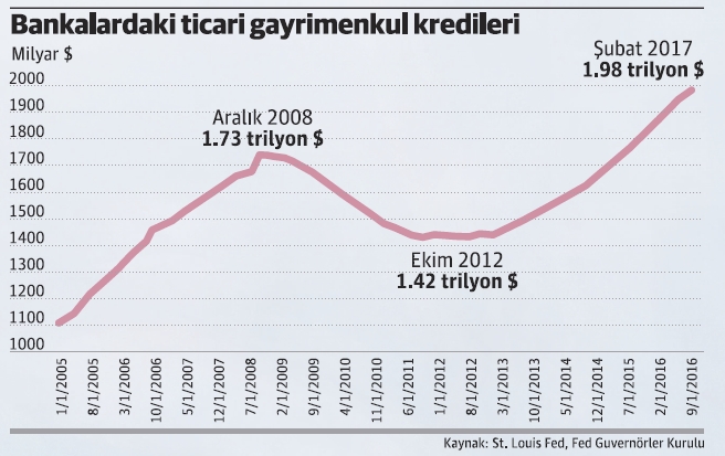 Fed, Kongre’ye gönderilen yarı yıl mali politikalar raporunda, yedi yıldır yükselişte olan sektörün çökmesinden endişe ettiğini dile getiriyor. Üstelik bu raporlarda sektörle ilgili sıkıntıya ilk kez vurgu yapılmıyor. Daha önce art arda beş kez bu endişe dile getirilmiş. Fed, iki yıl önce şubat raporunda bu piyasadaki değerlenmenin yarattığı baskıya ilk kez dikket çekmişti. O zamandan beri tüm yarı yıl raporlarında giderek daha sert bir dille uyarı yapılıyor ve aşırı değerlenmenin ticari gayrimenkul piyasasını negatif şoklar karşısında kırılgan yaptığı belirtiliyor.