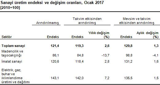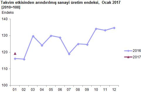 Takvim etkisinden arındırılmış sanayinin alt sektörleri (2010=100 temel yıllı) incelendiğinde, 2017 yılı Ocak ayında madencilik ve taşocakçılığı sektörü endeksi bir önceki yılın aynı ayına göre yüzde 13,7 azalırken, imalat sanayi sektörü endeksi yüzde 2,8 ve elektrik, gaz, buhar ve iklimlendirme üretimi ve dağıtımı sektörü endeksi yüzde 7,2 arttı.