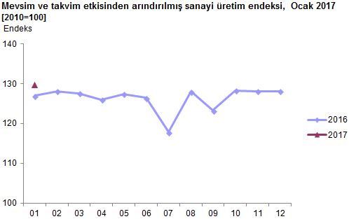 Takvim etkisinden arındırılmış sanayi üretim endeksi ocakta yıllık bazda yüzde 2,6 arttı. Beklenti, artışın yüzde 1.9 olacağı yönündeydi. Mevsim ve takvim etkisinden arındırılmış sanayi üretimi ise bir önceki aya göre yüzde 1,3 yükseldi.