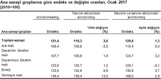 Mevsim ve takvim etkisinden arındırılmış ana sanayi grupları (MIGs) incelendiğinde, 2017 yılı Ocak ayında bir önceki aya göre en yüksek artış yüzde 3,7 ile enerjide gerçekleşti.