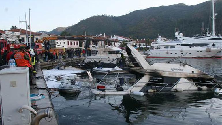 Marmaris’te yabancı bayraklı milyon dolarlık lüks yatların demirli bulunduğu yat limanında bugün saat 04.00 sıralarında bir motor yatta belirlenemeyen nedenle yangın çıktı. Polyester kaplı yatta alevler büyüyerek kısa sürede yanında bulunan bir motor yat ve bir yelkenli tekneye sıçradı. Alevleri gören çevredekiler durumu itfaiye ekiplerine bildirdi.
