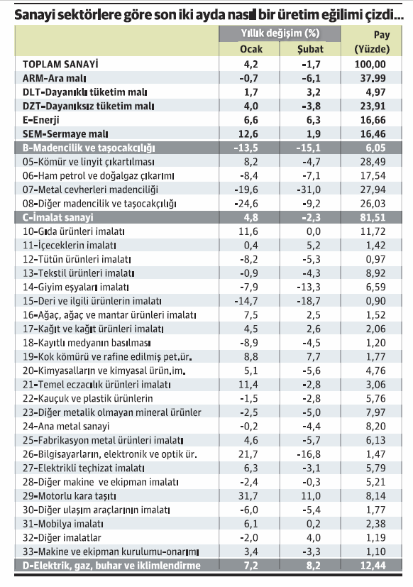 Sanayi üretiminin ana sanayi gruplarına göre ayrımında tek olumlu gelişme dayanıklı tüketim malları üretiminde görüldü. Bu grupta ocak ayında yüzde 1.7 olan geçen yılın aynı ayına göre üretim artışı, şubatta yüzde 3.2'ye çıktı. Ne var ki, dayanıklı tüketim mallarının toplam sanayi içindeki ağırlığı yalnızca yüzde 4.97 düzeyinde. Dolayısıyla bu malların üretimindeki artışın toplamı etkileme gücü çok çok az.