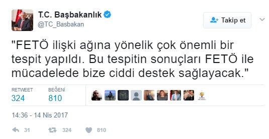 Başbakan Binali Yıldırım, FETÖ ile mücadeleyle ilgili olarak "Şu ara çok önemli bir tespit yapılmış durumda. Bu tespitin sonuçları, FETÖ ile mücadelede bize ciddi imkan sağlayacak. İşin seyri değişecek. Bunlarla ilgili detaylar önümüzdeki günlerde netleşecek, bu kadar söyleyeyim" dedi.