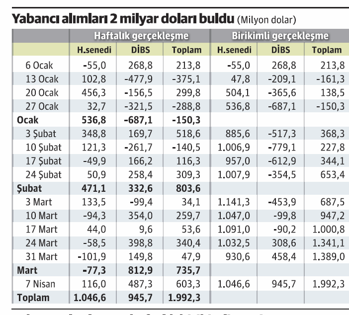 Önce yılbaşından 7 Nisan'a kadar olan üç ayı biraz aşkın dönemin toplu rakamlarını verelim. 1 Ocak-7 Nisan döneminde yabancı yatırımcılar 1 milyar 46.6 milyon dolarlık hisse senedi ve 945.7 milyon dolarlık devlet iç borçlanma senedi (DİBS) alımı gerçekleştirdiler. Böylece toplam alım 1 milyar 992.3 milyon dolar oldu.