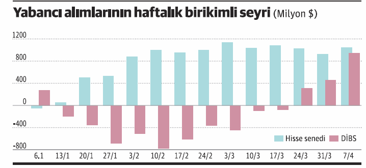 Ocak ve şubatta 537 ve 471 milyon dolar olan hisse senedi alımı, martta 77 milyon satışa dönüştü. Yabancılar, nisanın ilk haftasında ise 116 milyon dolarlık net alım yaptı.
