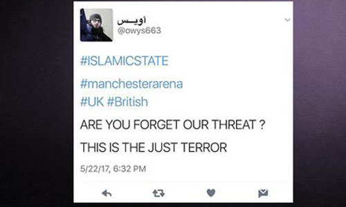 Owys663 (Üveys) adlı Twitter kullanıcısı akşam 6.32'de attığı tweet'te, konserin yapıldığı "Manchester Arena" etiketini "DEAŞ" etiketiyle birlikte kullanıp "Tehdidimizi unuttunuz mu? Bu adil bir terör" ifadesini kullandı.