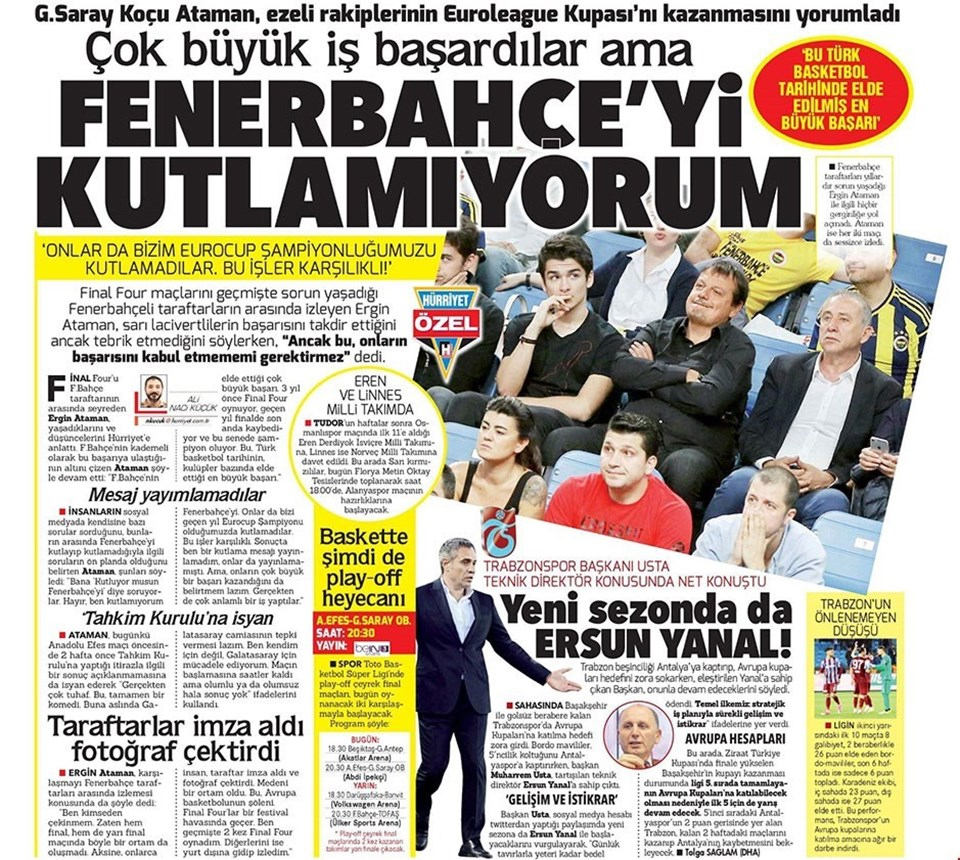 Fenerbahçe'nin Euroleague Final Four finalinde Olimpiakos ile oynadığı maçı tribünden takip eden Galatasaray Odeabank Başantrenörü Ergin Ataman, tarihi başarıyı değerlendirdi. Sarı-lacivertli ekibin 3 yılda kademeli olarak bu başarıya ulaştığının altını çizen tecrübeli antrenör, "Fenerbahçe elde ettiği çok büyük başarı. 3 yıl önce Final Four oynuyor, geçen yıl finalde son anda kaybediyor ve bu senede şampiyon oluyor. Bu, Türk basketbol tarihinin, kulüpler bazında elde ettiği en büyük başarı" dedi.