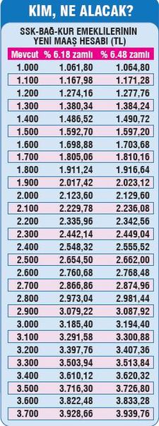 Eğer zam oranı yüzde 6.48 olarak gerçekleşirse, en düşük maaş 2000'den önce emekli olan SSK'lılarda bin 402 liradan bin 493 liraya, 2000'den sonra emekli olan SSK'lılarda ise 827,62 liradan 881,25 liraya yükselecek. Taban maaş; Bağ-Kur esnaf emeklilerinde bin 184 liradan bin 260 liraya, Bağ- Kur tarım emeklilerinde 875,50 liradan 932,23 liraya çıkacak. Temmuz zammı yüzde 6.48 olarak gerçekleşirse, halen bin 500 lira olan maaş bin 597 lira 20 kuruşa ulaşacak. 2 bin lira olan maaş 2 bin 129 liraya, 2 bin 500 lira olan maaş da 2 bin 662 liraya yükselecek.