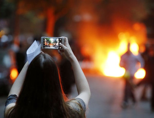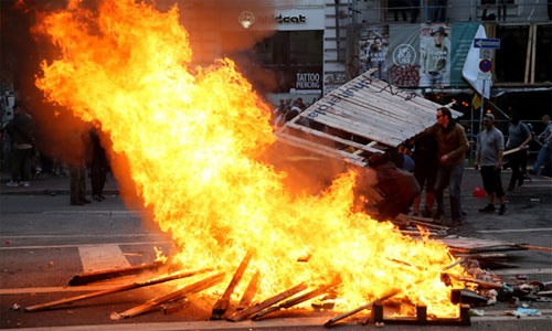 Göstericiler, burada caddelerde oluşturdukları barikatları ateşe verdi. Metrelerce yükseklikte alevlerin görüldüğü bölgede binaların arasından dumanlar yükseldi.