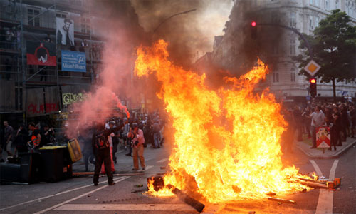 Hamburg'da gün boyunca devam eden gösterilerde, çok sayıda araç ve barikat ateşe verilmişti.