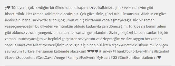 İşte Yolanthe Cabau'nun paylaştığı o Türkçe veda metni: “Türkiyem; çok sevdiğim bir ülkesin, bana kapınızı ve kalbinizi açtınız ve kendi evim gibi hissettirdiniz. Her zaman kalbimde olacaksınız. Çok güzelsiniz, güzel ruhlu insansınız! Allah'ın en güzel hediyesini bana Türkiye'de sundu; oğlumu! Ve hiç bir zaman vedalaşmayacağız, hiç bir zaman vazgeçmeyeceğim bu ülkeden ve mümkün olduğu kadarıyla geri döneceğim. Türkiye siz benim ailem gibi oldunuz ve sizin yengeniz olmaktan her zaman gururlandım. Sizin gibi güzel kalpli insanları hiç bir zaman unutmayacağım ve hepinizi gerçekten seviyorum ve özleyeceğim ve size saygım her zaman sonsuz olacaktır! Misafirperverliğiniz ve sevginiz için hepinizi içten teşekkür etmek istiyorum! Seni çok seviyorum Türkiye, her zaman kalbimde olacaksın! Turkey”