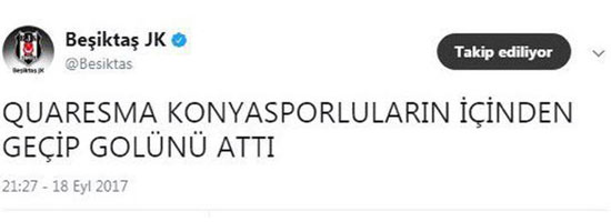 Ricardo Quaresma'nın golünün ardından BJK Twitter hesabı "Quaresma Konyasporluların içinden geçip golünü attı" paylaşımını yaptı. Beşiktaş resmi Twitter hesabı, tweeti kısa bir süre sonra kaldırdı.