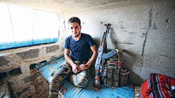 Ancak dert yanmıyoruz, hepsinin üstesinden geliriz. Silahımız var, silahlandıracak gençlerimiz var. Türkiye’den tek isteğimiz bizi desteklemesi. Pirinç, makarna ya da silah istemiyoruz, bize manevi destek versin kafi” şeklinde konuşan Muratlı, birden DAEŞ’in keskin nişancılarının menzilinde olan sınır hattına gitmek isteyip istemediğimi soruyor. Düşünmeden, ‘Evet’ deyince, bir arazi aracıyla taburdan ayrılıyoruz. Sınır hattına vardığımızda 40 derecenin üzerindeki sıcakta nöbet tutan Türkmen gençlerle sohbete dalıyoruz.
