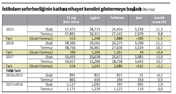 Örneğin bu yıl ocak-temmuz farkı olarak istihdam 2.1 milyon kişi artmış, istihdamdaki bu artış işgücü artışının (1.5 milyon) üstüne çıkınca işsiz sayısı 542 bin azalmış.