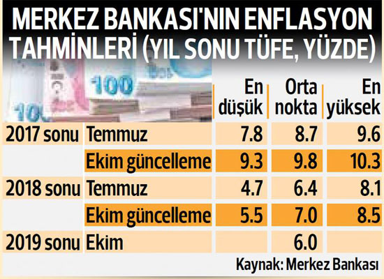 Enflasyon Raporu’nu açıklayan Merkez Bankası Başkanı Murat Çetinkaya, 2018 sonunda yüzde 7, 2019 sonunda ise yüzde 6’lık bir tahmin yaptıklarını açıklarken, yüzde 5’lik enflasyon hedefinin “orta vadede” erişilebilir olacağını söyledi. Bu yıl sonu için yapılan yukarı yönlü 1.1 puanlık enflasyon güncellemesinde katkı veren unsurların; ithalat fiyatları yani kur etkisinden 0.5 puan olduğu, çıktı açığındaki yukarı yönlü güncellemeden (talep fazlasının belirmesi) dolayı 0.4 puan, enflasyon ana eğilimindeki yükselişten de 0.2 puanlık katkı olduğu görülüyor. Banka, 2017 için yıllık yüzde 10, 2018 için de yüzde 7 öngördüğü gıda fiyat artışı varsayımını değiştirmemiş.