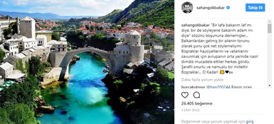 Instagram hesabından Bosna Hersek'teki Mostar Köprüsü'nün fotoğrafını paylaşan Şahan Gökbakar, isim vermeden Kütahyalı'ya tepki gösterdi.