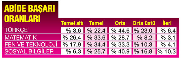 Geçen yıl Milli Eğitim Bakanlığı (MEB), Akademik Becerilerin İzlenmesi ve Değerlendirilmesi (ABİDE) Projesi’ni “ileriye yönelik eğitim politikalarının geliştirilmesinde kullanmak” üzere yaşama geçirdi. “Türk usulü PISA” olarak da nitelendirilen ABİDE’nin ilk sonuçları da çıktı. Buna göre öğrencilerin % 26.4’ü matematik, % 17.9’u fende en alt düzeyde. 81 il 495 ilçedeki 1299 okuldan 38 bin 8. sınıf öğrencisinin katılımıyla yapılan araştırmada Türkçe, matematik, fen ve teknoloji, sosyal bilgiler olmak üzere 4 dersten çoktan seçmeli ve açık uçlu sorular yer aldı. Her dersten 51 soru yöneltildi. Çalışmada başarıyı etkileyen faktörler de ölçüldü.